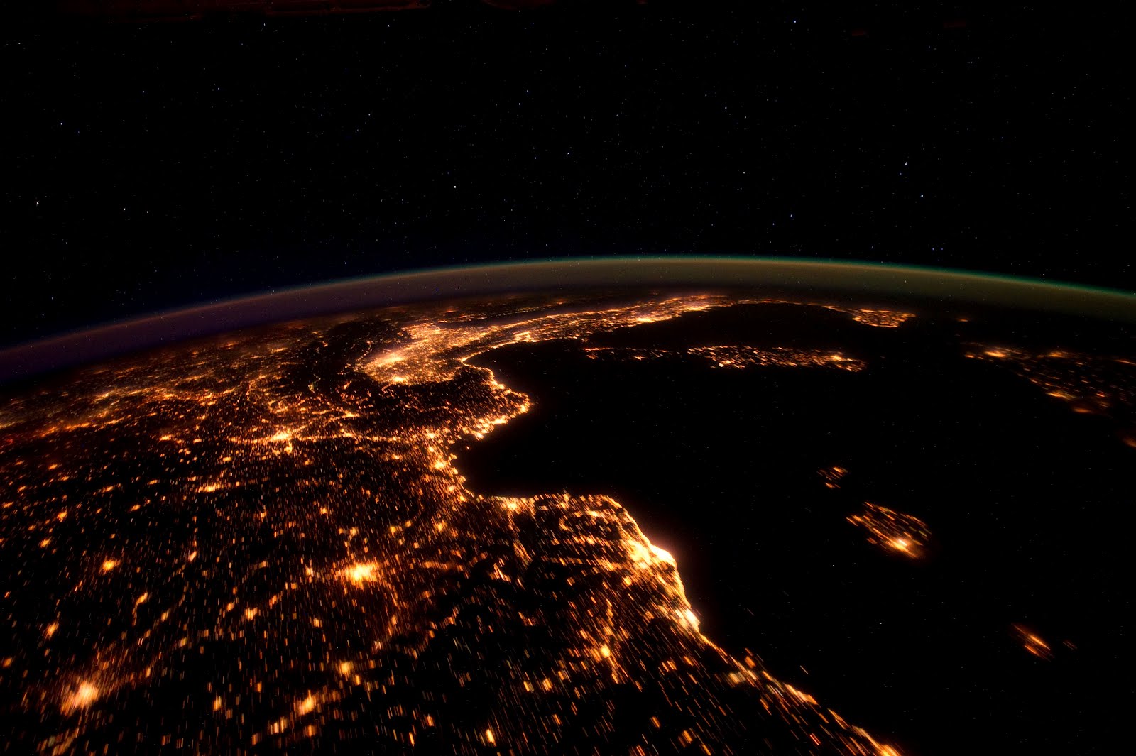 España. Imagen tomada desde la Estación Espacial Internacional. El estrecho de Gibraltar está en la esquina inferior derecha, Madrid es el punto más brillante en el centro.